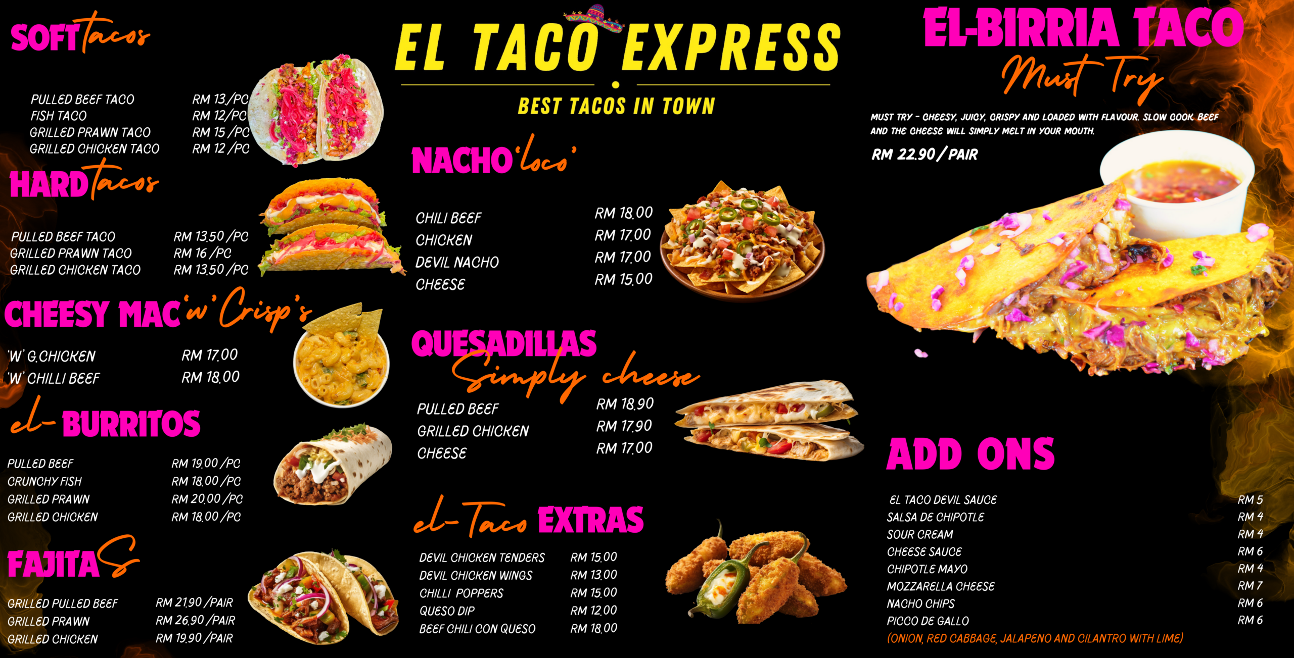 El Taco Express is born from a deep love for authentic Mexican street food. Founded by Mr. PK and Kirti, we bring bold Mexican flavours to the streets of Johor Bahru with fresh ingredients, traditional recipes, and a passion for great food—served fast, honest, and full of flavour. 🌮
